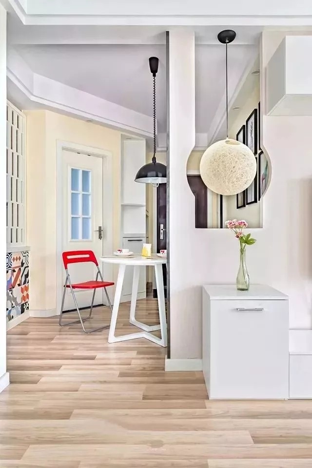 客厅与餐厅之间的墙被打通了一块,挂上一盏球形的竹篮吊灯,一进大门就看到这样一个若隐若现的一幕,显得优雅格外。
