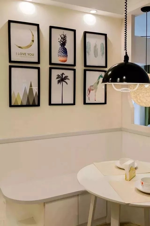 小小的餐桌,搭配一张简易小椅子,还有一排收纳卡座,紧凑的小空间也充满了情趣。