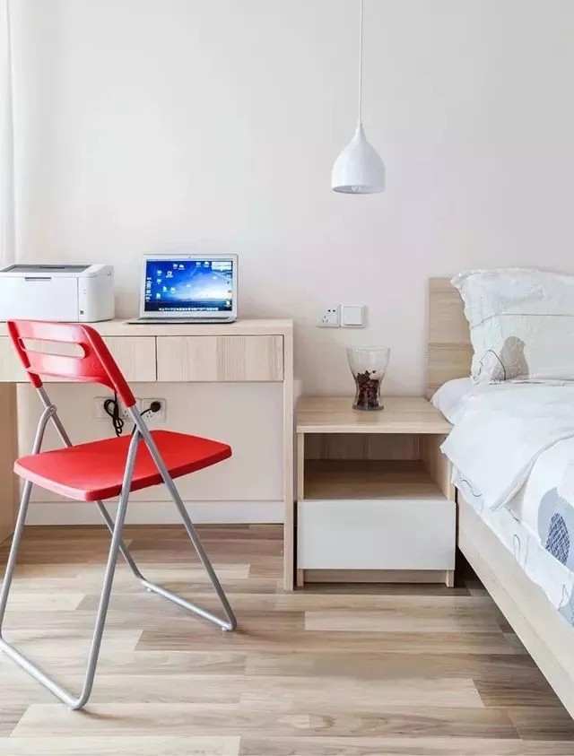 床头两侧,分别是床头柜与小书桌,搭配上垂下来的吊灯,显得更有空间感。