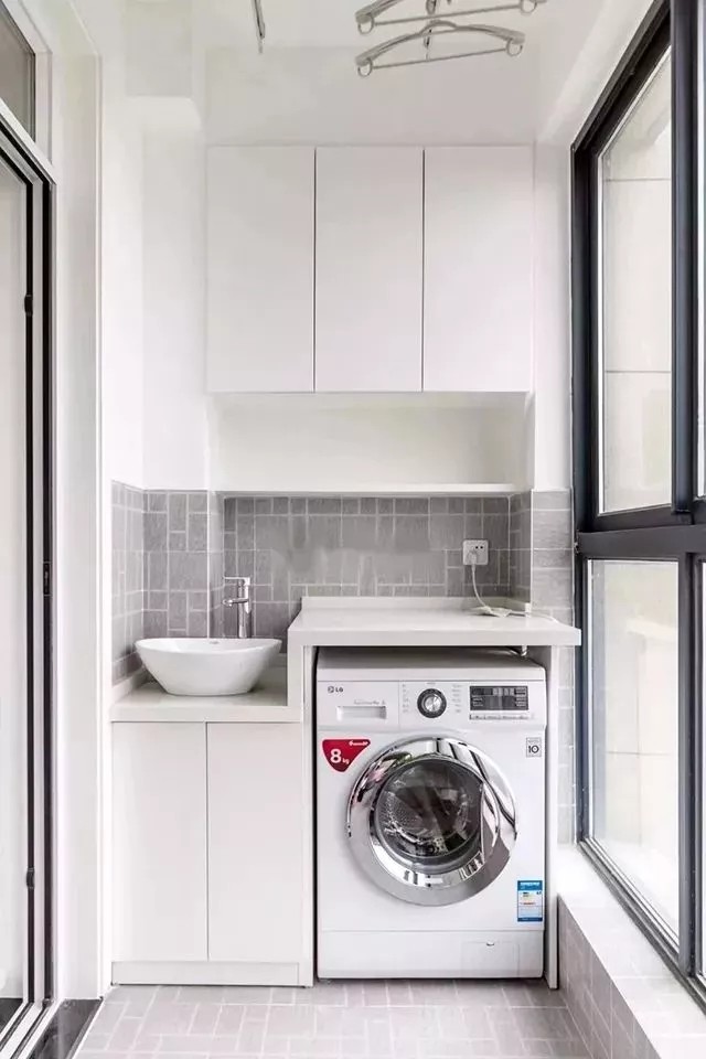 阳台墙面和地面用的灰色砖,洗衣机与洗手盆组合一起,上方还装个吊柜,整体简洁大方又实用。