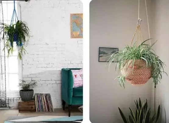 审美:吊兰叶片细长柔软,从叶腋中抽生出小植株,由盆沿向下垂,舒展散垂,似花朵,因此吊挂起来能更好地配合它的生长姿态。