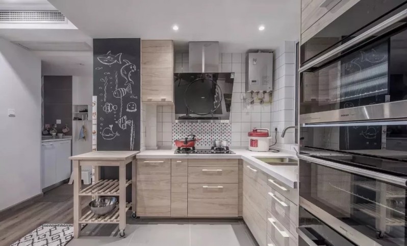 开放式厨房,地面铺灰砖,墙面铺小白砖,搭配木色柜门,自然而温馨。