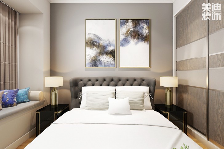 把床斜放在角落里需留出360*360厘米的空间。这个很适合较大卧室的摆放,还可根据床头后面的空地大小,决定是否摆放储物柜。
