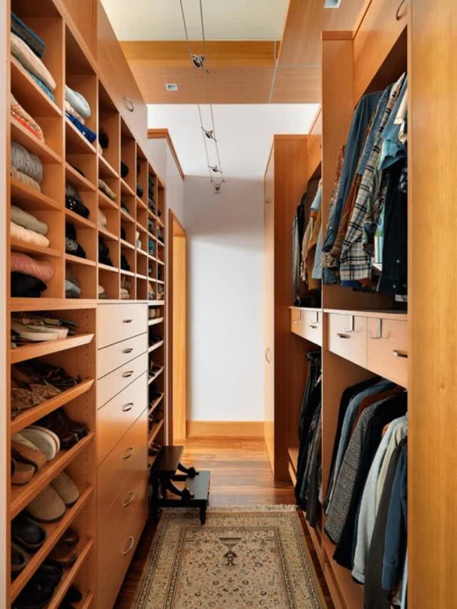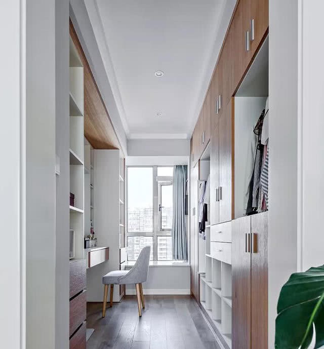 走廊算是家里最浪费面积的地方,户型不好的房子走廊大部分又暗又长,与其浪费,不如把这块空间完全利用起来,两面的墙壁是最好的依托,采用嵌入式设计,再做好内部分层工作就能得到一个完美衣帽间。
