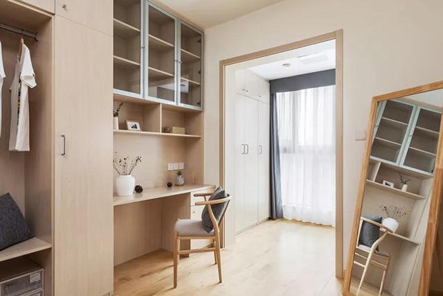 如果你的卧室没有额外的地方弄成衣帽间,可以考虑把另外一个房间变成多功能的区域。比如书房可以很轻松的和衣帽间合并为一体,定制好书桌与橱柜,既保证了舒适度又做到了收纳储物。